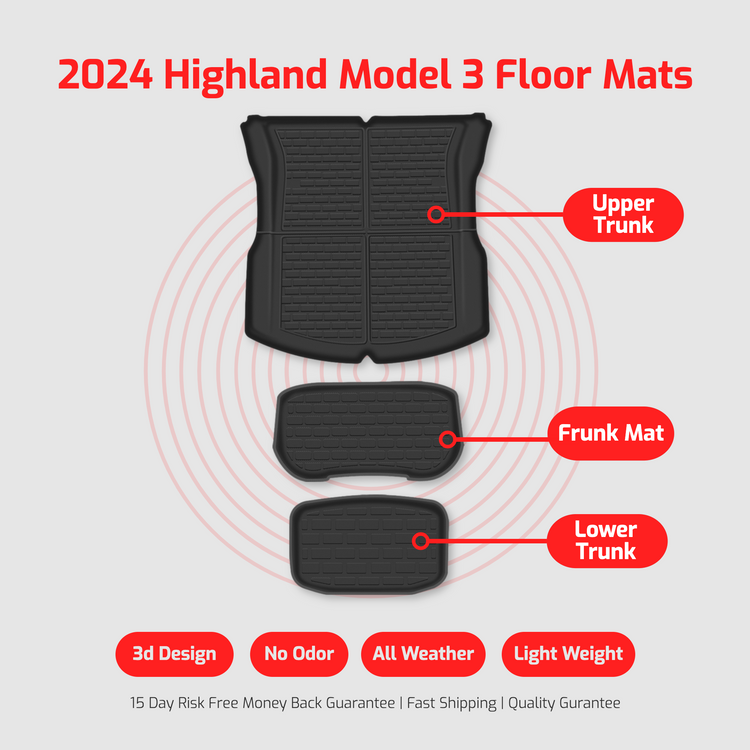 Constructed from high-quality TPR/XPE materials, these mats not only deliver robust protection but also add a touch of sophistication to your car's interior. The precision-cut design ensures a seamless integration with the Model 3's floor layout, maintaining the aesthetic appeal of your vehicle while serving a practical purpose.